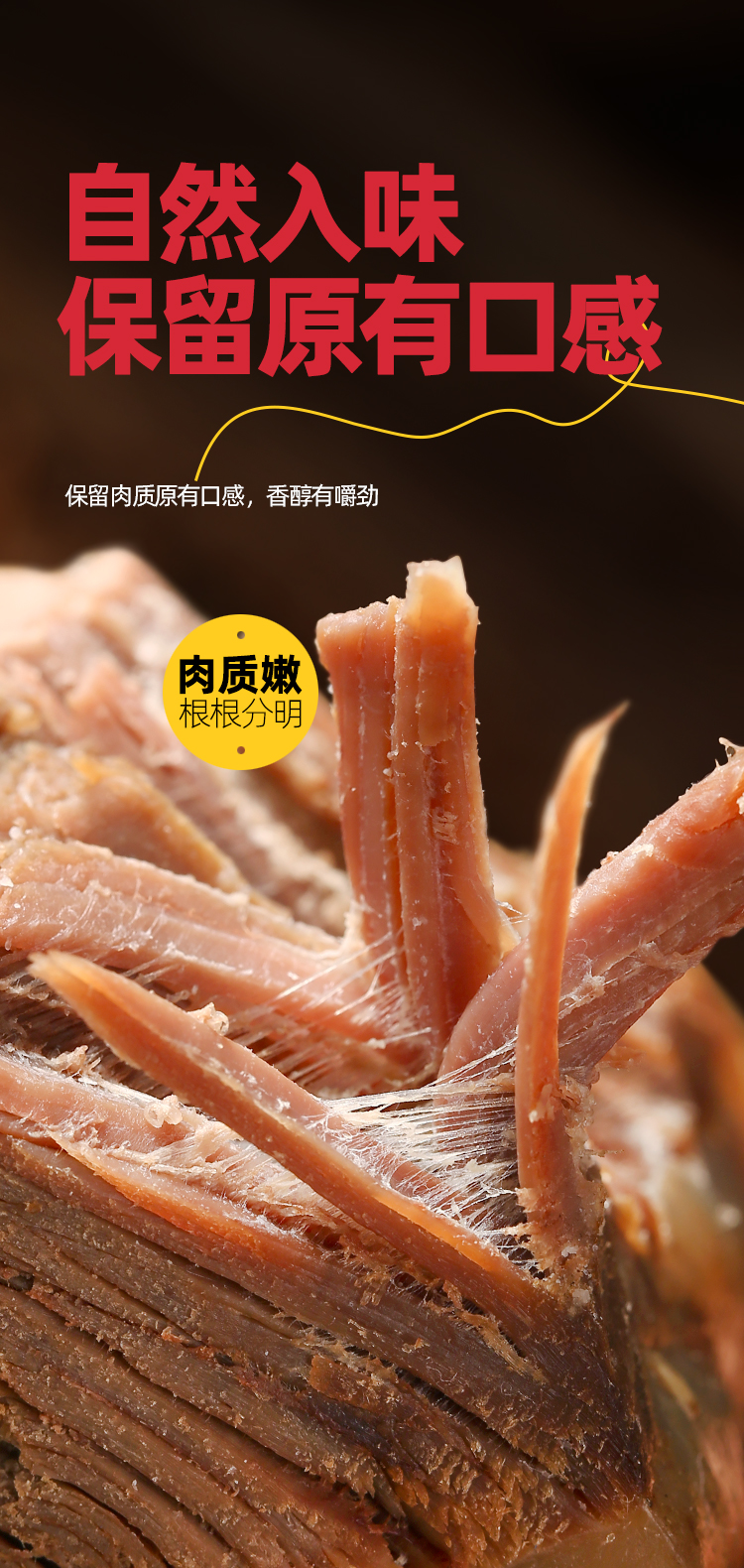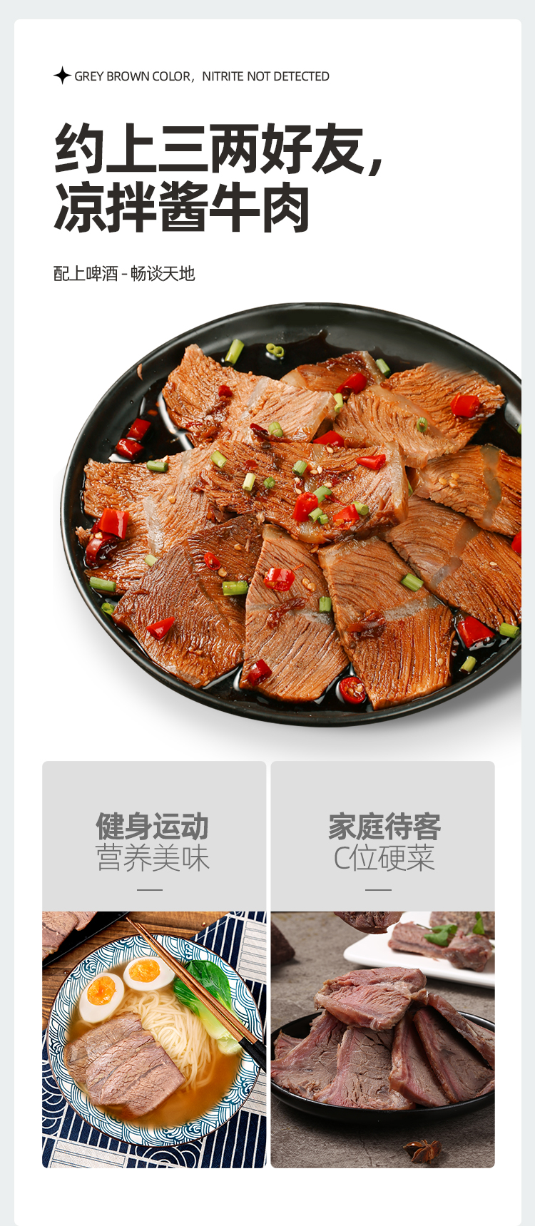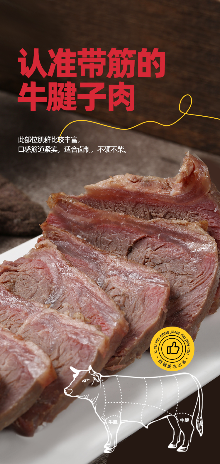 真香警告!隔着屏幕闻到肉香!真正0添加的【带筋牛腱肉】 真的是我吃过最好吃的酱牛腱肉! 100%真牛腱肉,劲道紧实,不硬不柴; 真正0添加,灰褐色泽,很安心! 0亚硝酸盐,0防腐剂,0色素,0保水剂,0卡拉胶! 低碳水高蛋白 蛋白质含量47%! 香辛料发酵入味,肉质嫩,根根分明! 下酒、煮面、凉拌、直接吃…… 简便快捷健康美味,百吃不会胖,简直是减肥美食