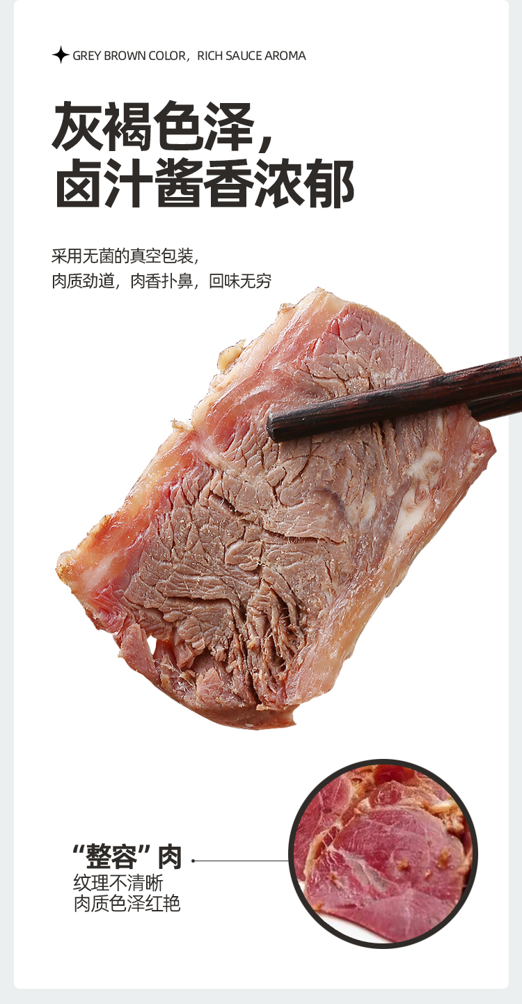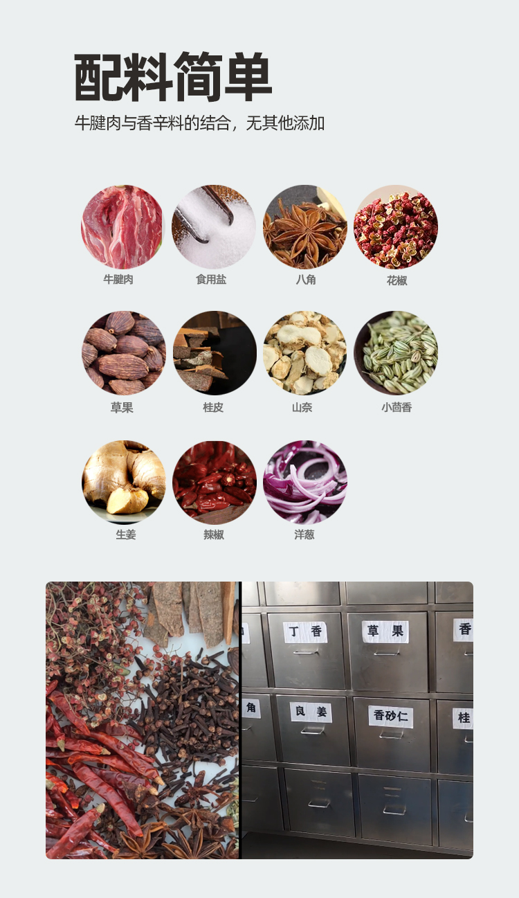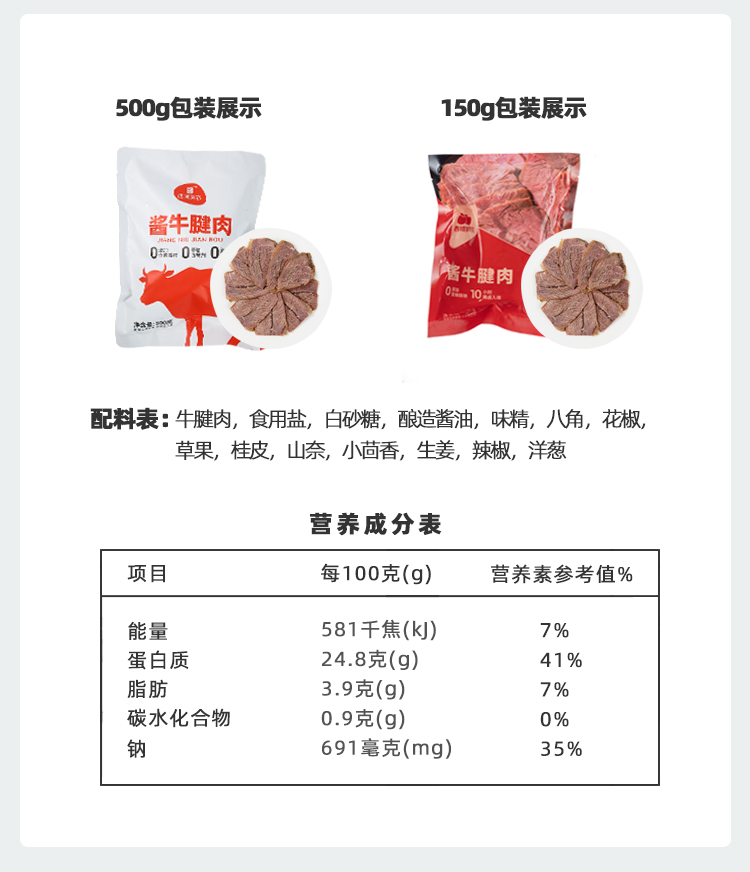 真香警告!隔着屏幕闻到肉香!真正0添加的【带筋牛腱肉】 真的是我吃过最好吃的酱牛腱肉! 100%真牛腱肉,劲道紧实,不硬不柴; 真正0添加,灰褐色泽,很安心! 0亚硝酸盐,0防腐剂,0色素,0保水剂,0卡拉胶! 低碳水高蛋白 蛋白质含量47%! 香辛料发酵入味,肉质嫩,根根分明! 下酒、煮面、凉拌、直接吃…… 简便快捷健康美味,百吃不会胖,简直是减肥美食