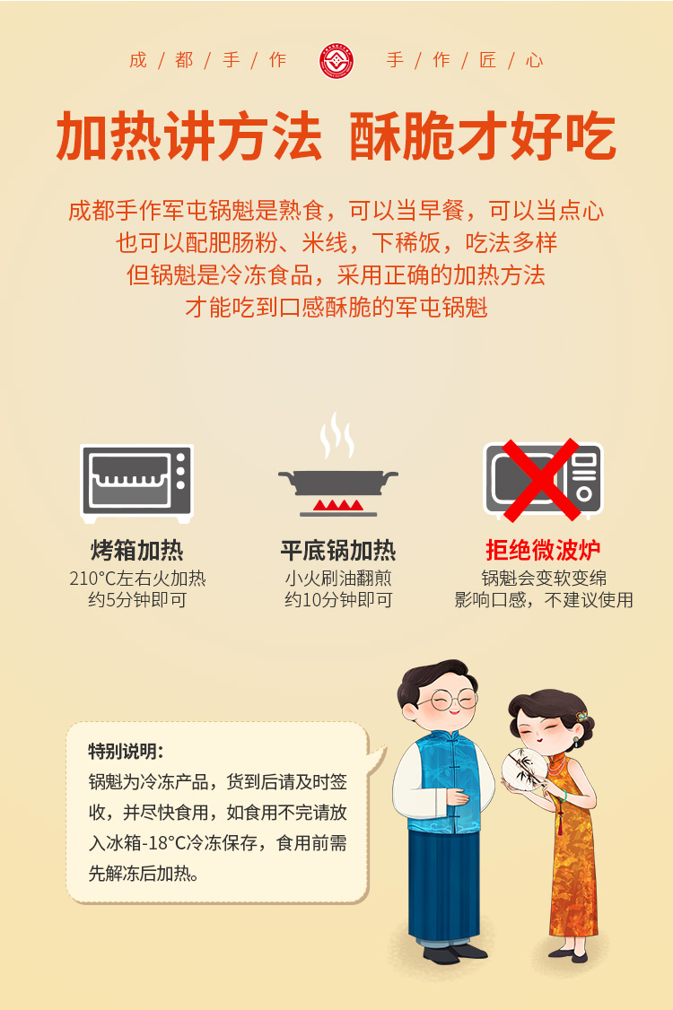 军屯锅魁是熟食,但必须加热并热透才能食用,冷冻后需自然解冻再加热,推荐以下加热方法: