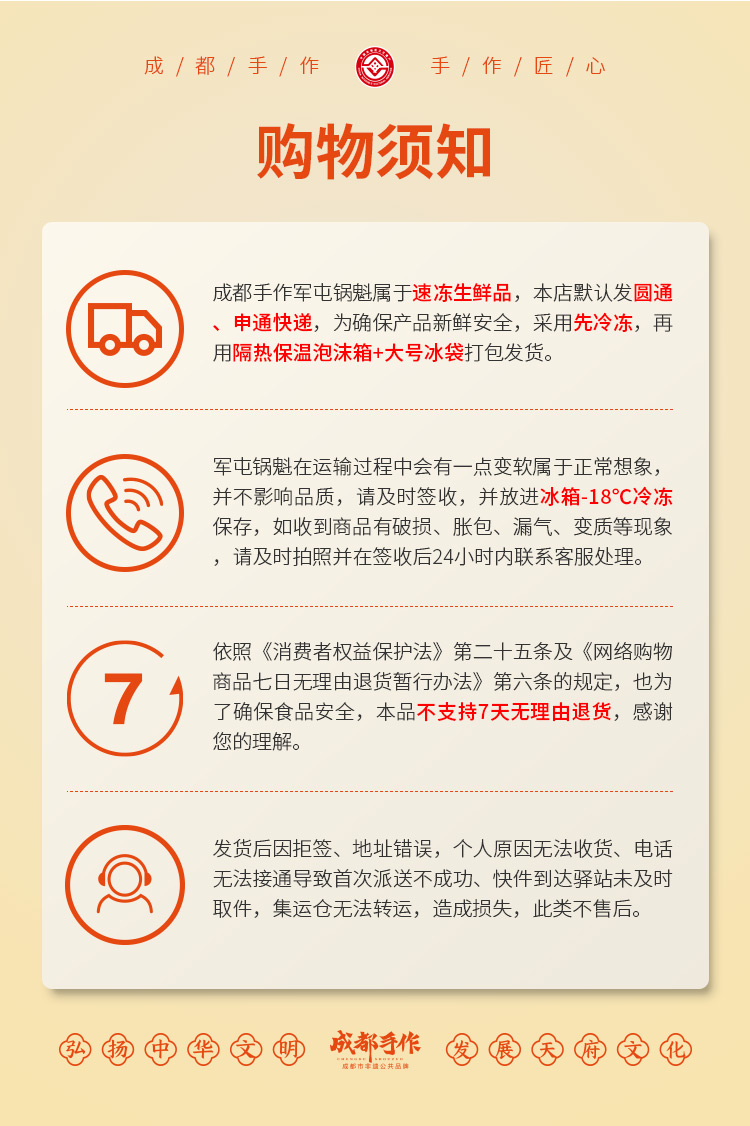 【关于售后】由于锅魁属于冷冻食品,故发出后的不可随意拒收或者运输途中申请退款,如买家拒收,产生的运费及产品损坏由买家承担。