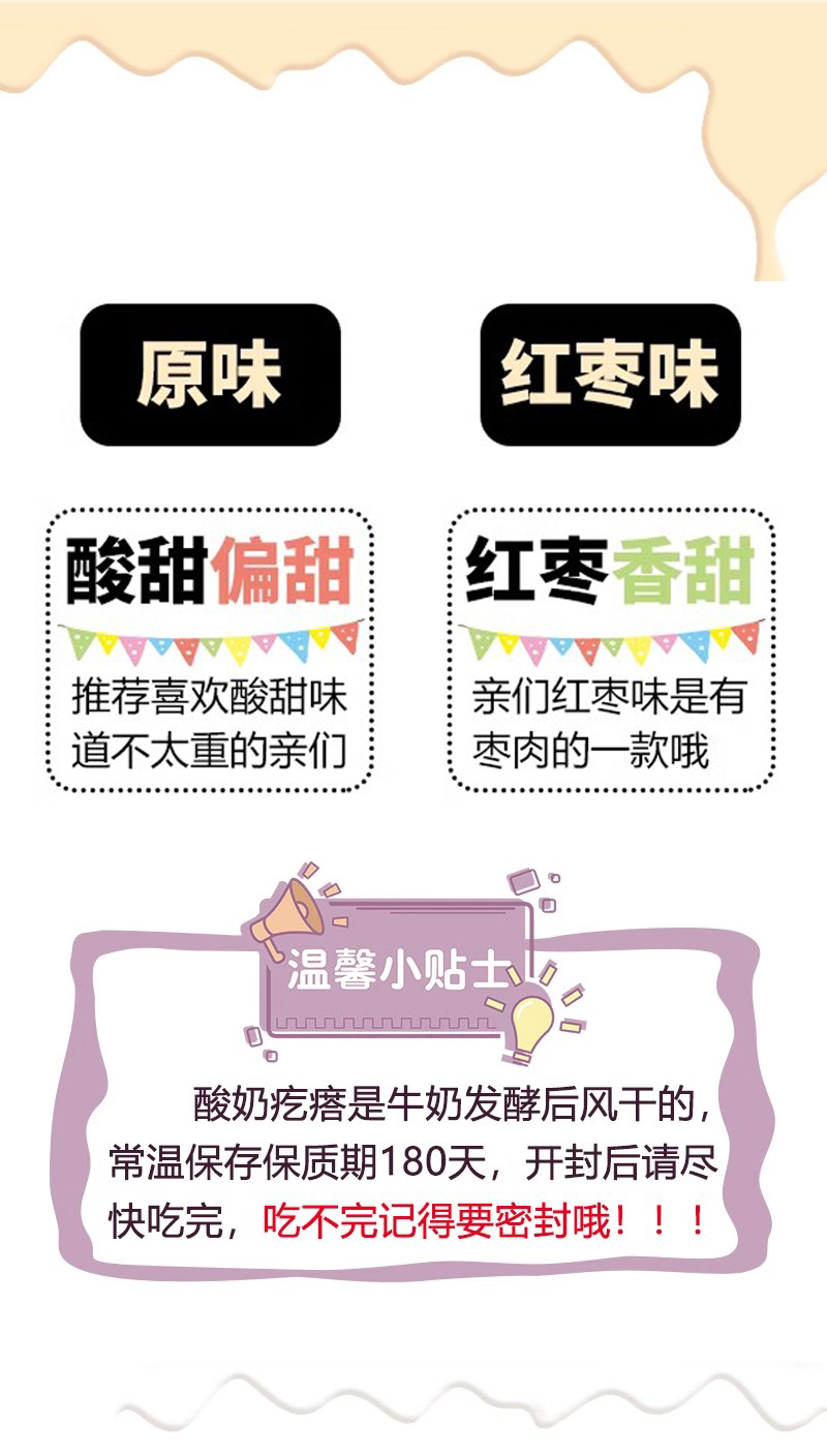 注:酸奶疙瘩是牛奶发酵后风干的,常温保存保质期为270天,开封后请尽快吃完。记得吃不完记得要密封哦!