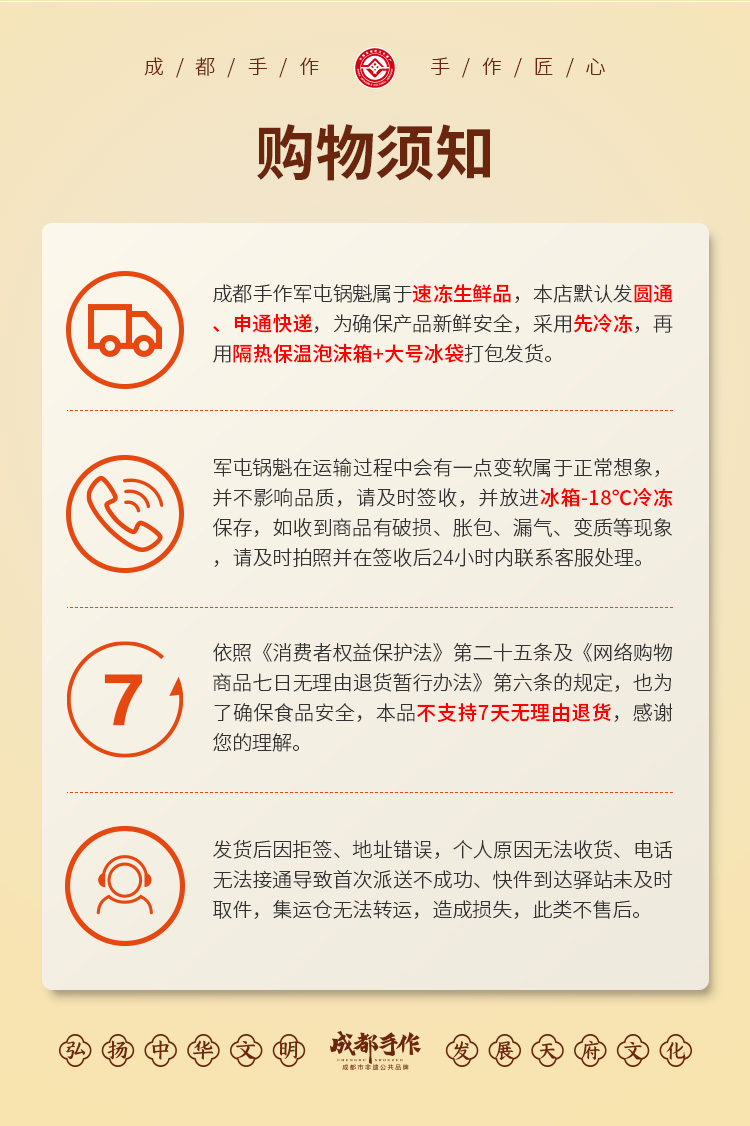 【关于售后】由于锅魁属于冷冻食品,故发出后的不可随意拒收或者运输途中申请退款,如买家拒收,产生的运费及产品损坏由买家承担。
